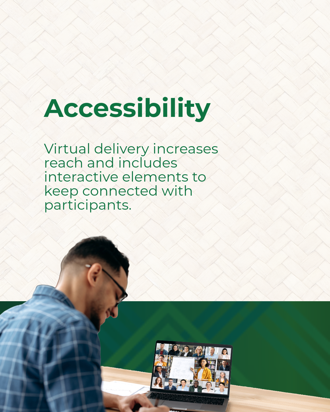Accessibility: Virtual delivery increases reach and includes interactive elements to keep connected with participants.