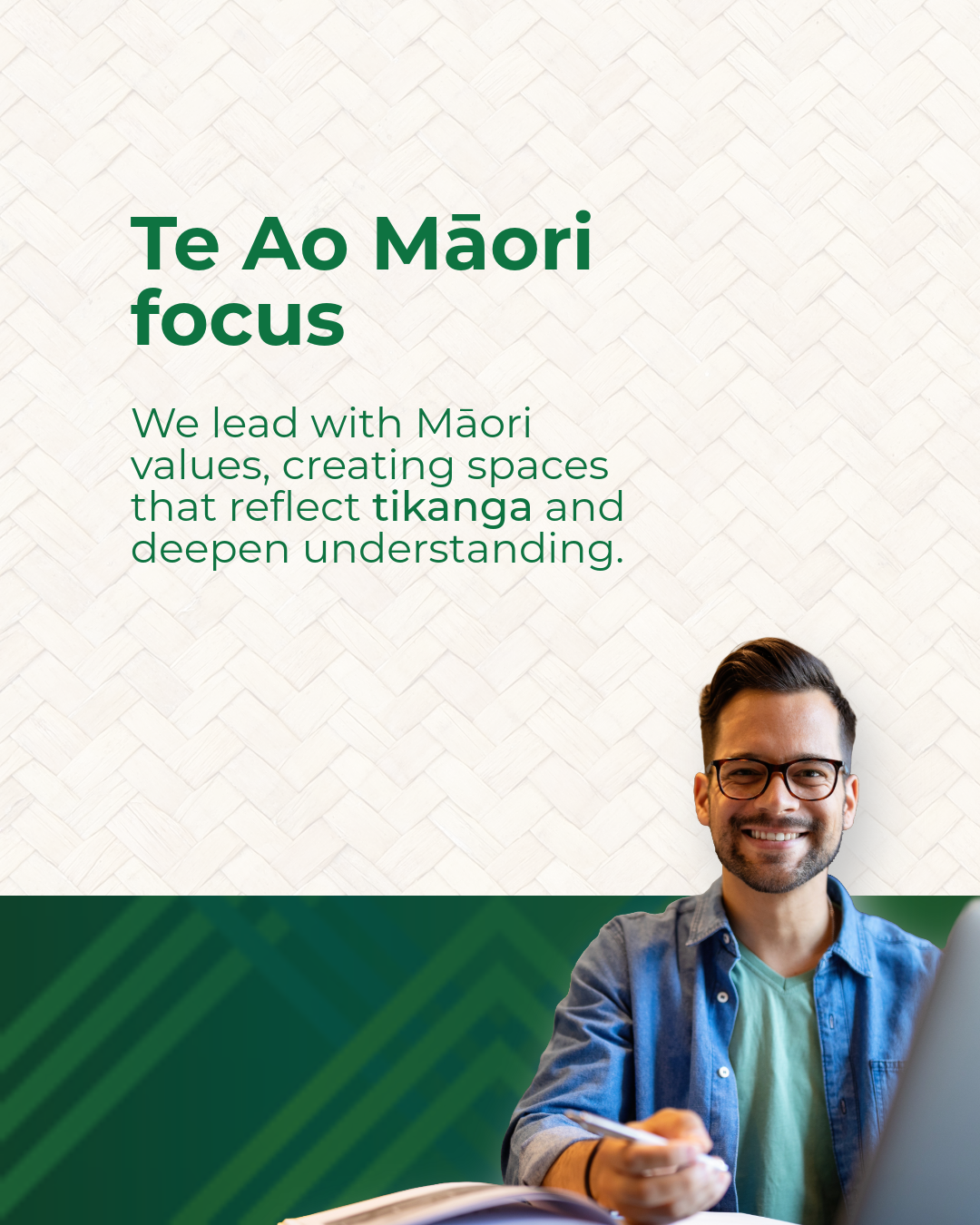 Te Ao Māori focus: We lead with Māori values, creating spaces that reflect tikanga and deepen understanding.